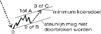 Golf 3 is meestal de krachtigste golf en laat een grote acceleratie zien in relatie tot golf 1 en 5. Als golf 3 inderdaad een bijna verticale stijging of daling laat zien, teken dan een trendlijn die golf 2 en 4 met elkaar verbindt en een parallelle lijn vanaf golf 1(!). Deze parallelle lijn zal golf 3 doorsnijden en het koersdoel van golf 5 aangeven. De ervaring leert dat dit een zeer waardevol trendkanaal is.