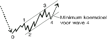 Zodra golf 3 voltooid is kunt u een trendkanaal tekenen door het eind van golf 1 en golf 3 met een trendlijn te verbinden en een parallelle lijn te tekenen vanaf het eind van golf 2. Op deze manier kunt u een koersdoel projecteren voor golf 4. Onthoudt dat gewoonlijk de basislijn van golf 2 enigszins wordt doorbroken door de koersbeweging van golf 4. De basislijn dient als een minimum koersdoel voor golf 4. Als golf 4 helemaal niet bij de basislijn komt, is dit een teken van een zeer sterke trend. Dan is golf 3 waarschijnlijk nog steeds in ontwikkeling of u moet zich voorbereiden op een koersversnelling in golf 5.