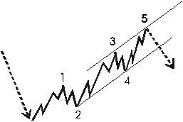 Zodra golf 4 is geëindigd kunt u een trendkanaal tekenen door het eind van golf 2 en golf 4 met een trendlijn te verbinden en een parallelle lijn te tekenen vanaf het eind van golf 3. Op deze manier kunt u een koersdoel voor golf 5 projecteren. In de meeste gevallen zal golf 5 er niet in slagen de bovenste trendlijn te bereiken, behalve wanneer u te maken heeft met een extensie in golf 5 of als golf 3 relatief zwak is geweest. In een extensie, ook aangegeven door hoge volume en momentum indicatoren, kan een "throw over" (korte uitbraak) voorkomen.