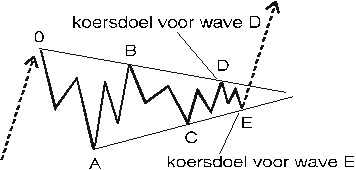 Zodra golf B voltooid is kunt u een trendlijn tekenen en het begin van golf A en het eind van golf B verbinden om een koersdoel voor golf D te verkrijgen, vooropgesteld dat zich zeker een driehoek ontwikkelt, hetgeen duidelijker is na de voltooiing van golf C.